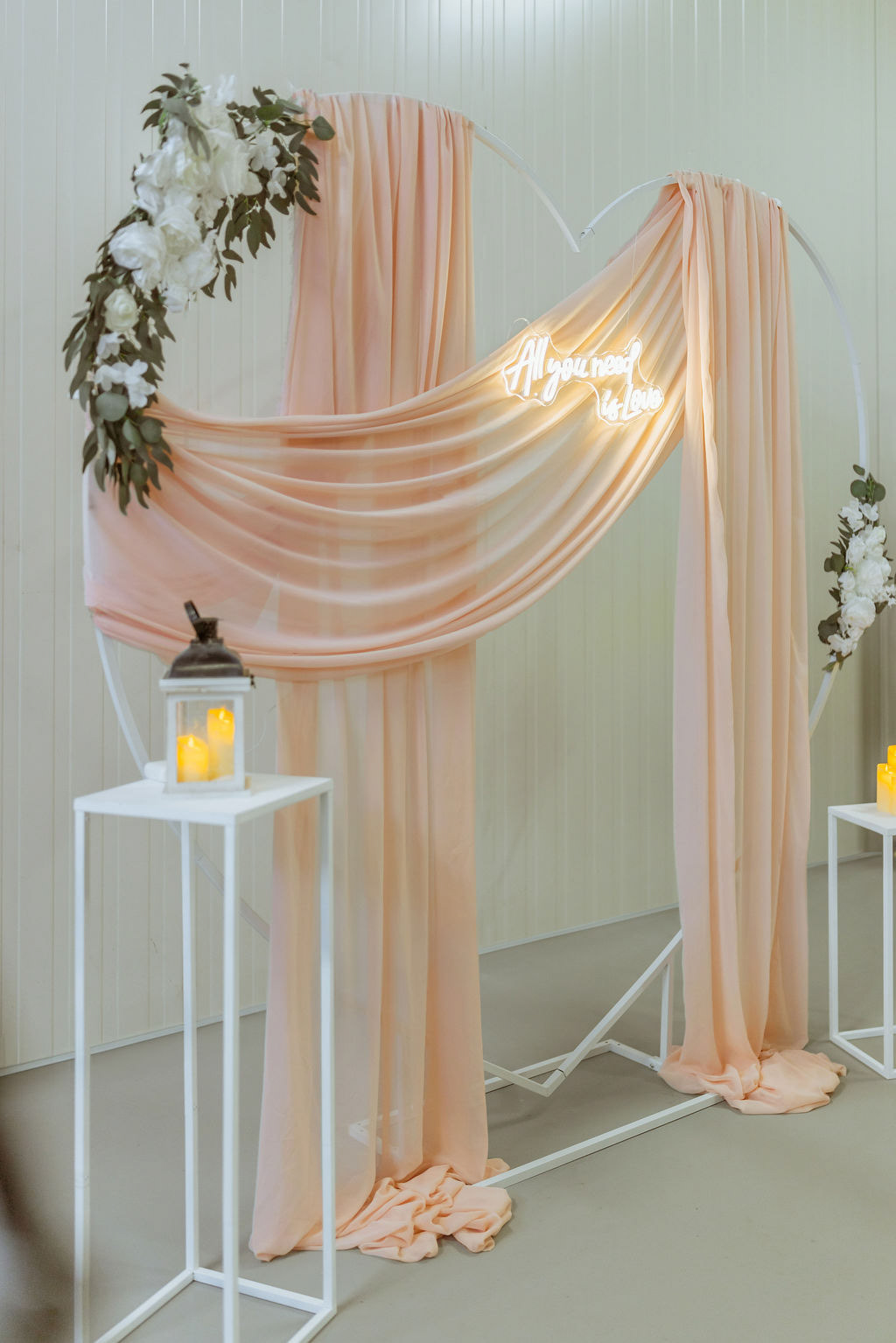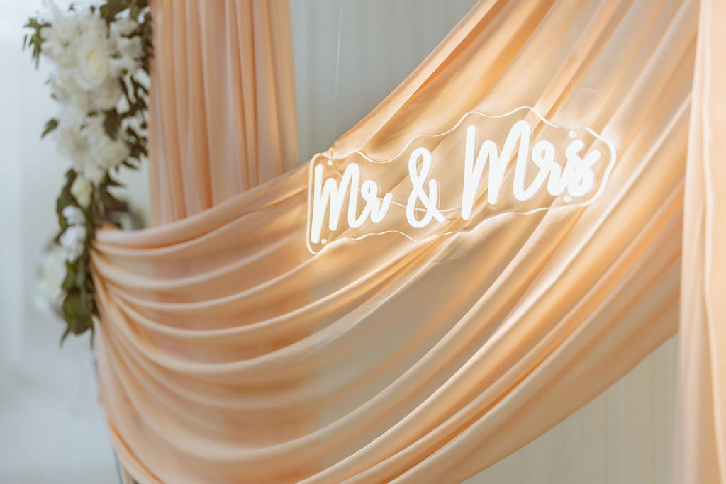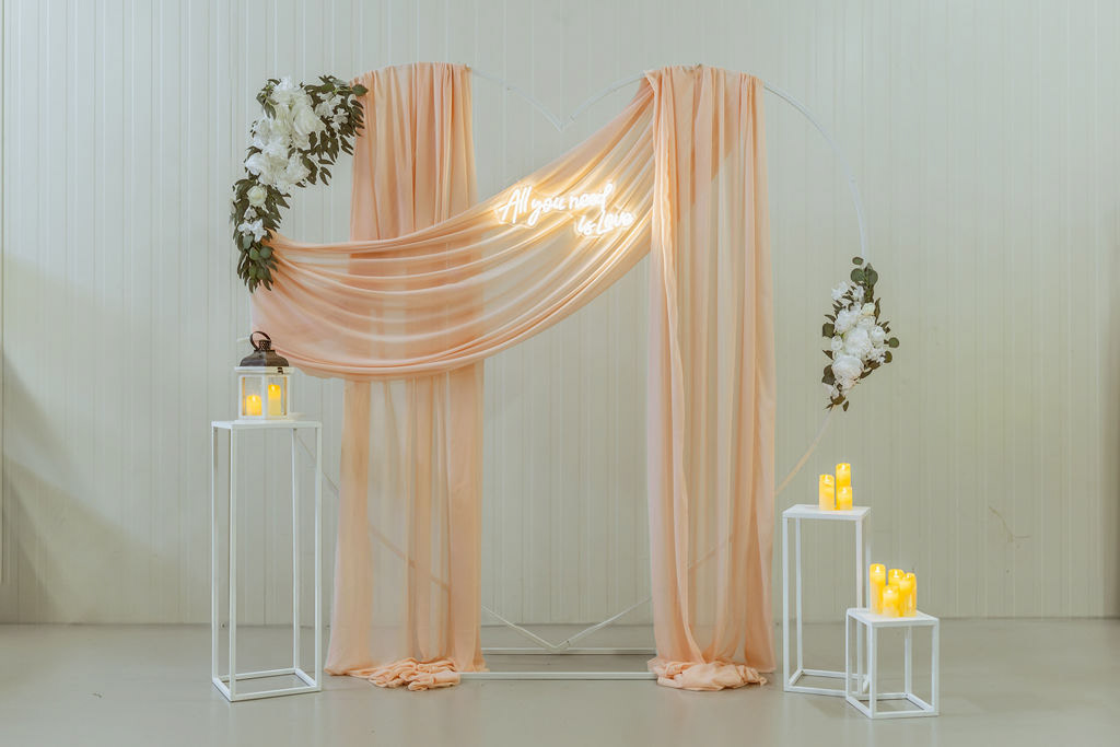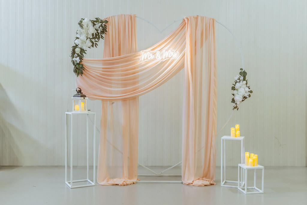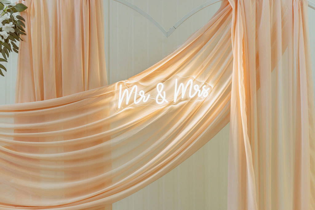 Lehká růžová textilie v podobě šifonu je elegantně aranžovaná na kovové konstrukci ve tvaru srdce a doplněná květinovou výzdobou v neutrálních tónech. Dominantním prvkem je světelný nápis „Mr & Mrs“, který podtrhuje svatební atmosféru a dodává fotografiím romantický nádech. Jemné teplé LED osvětlení vytváří lichotivé světlo pro focení během dne i večera.