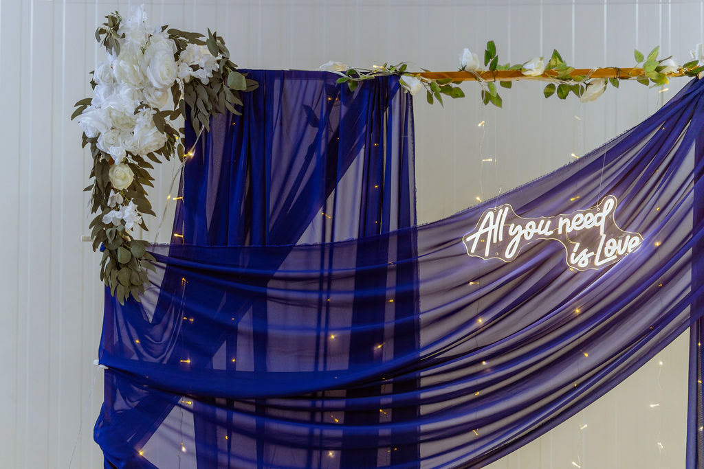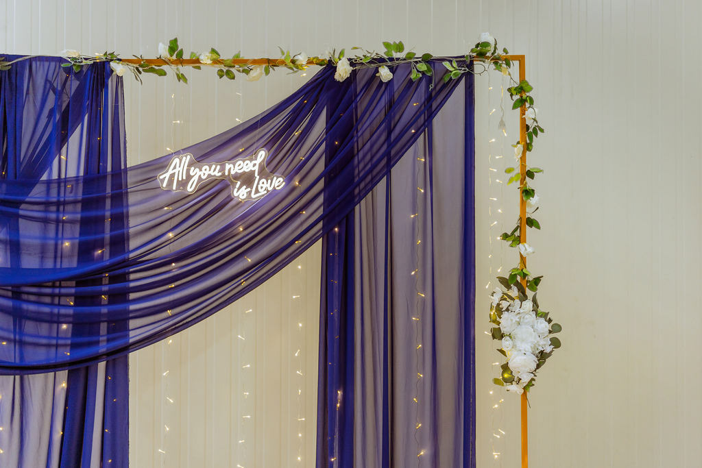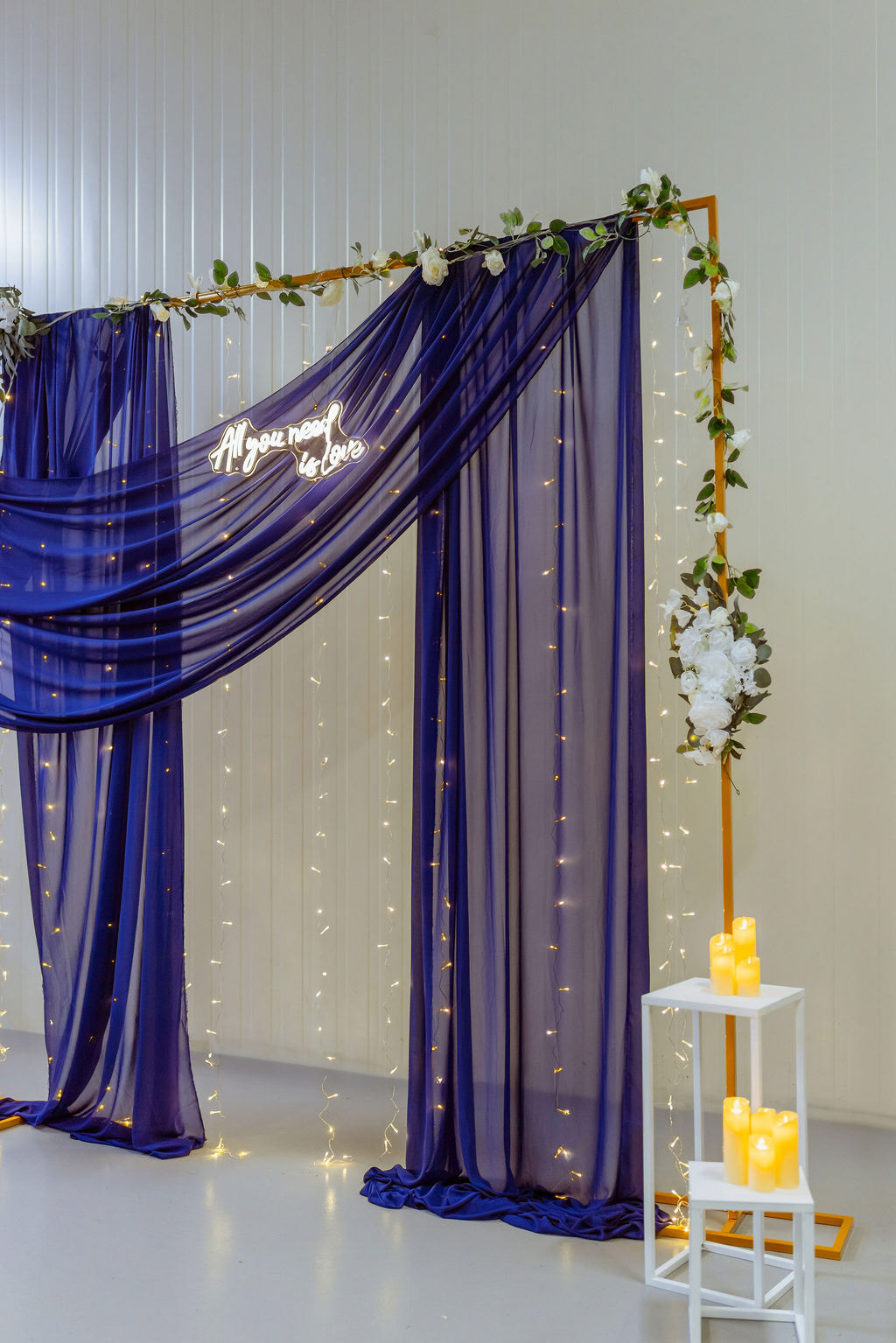 Splývavá látka v podobě šifonu v kombinaci s teplým LED světelným závojem vytvářejí příjemnou atmosféru a lichotivé světlo pro focení. Zlatý kovový rám doplněný květinovou výzdobou dodává fotostěně luxusní vzhled. Světelný nápis se stává výrazným designovým prvkem a přirozeným středobodem svatebního fotokoutku.