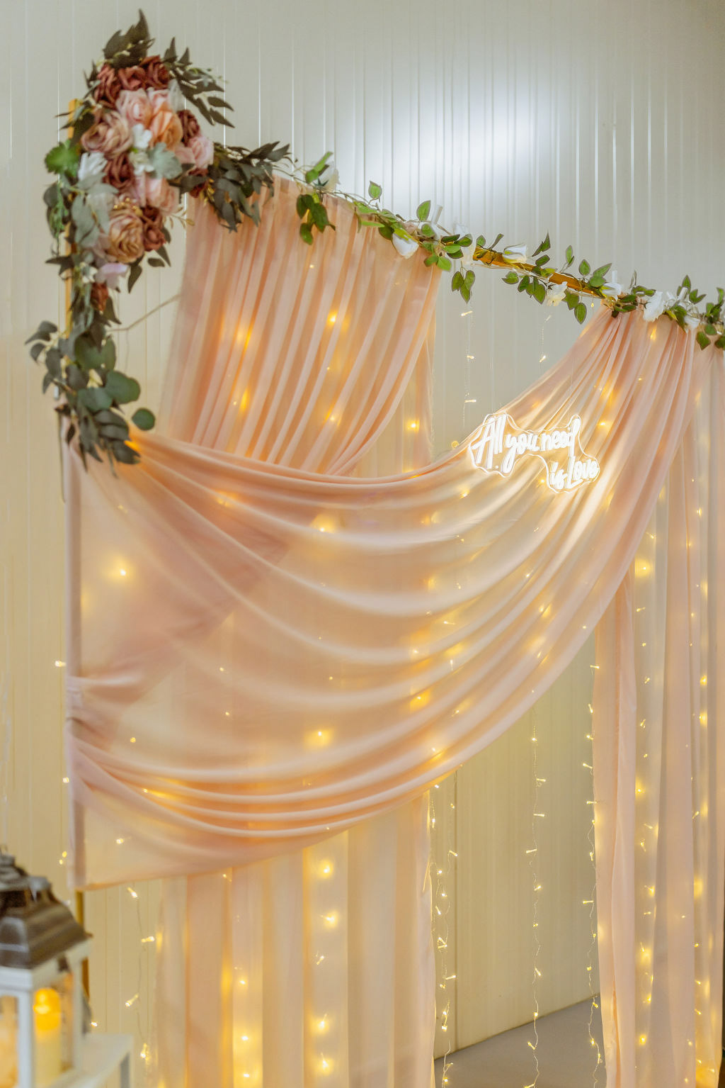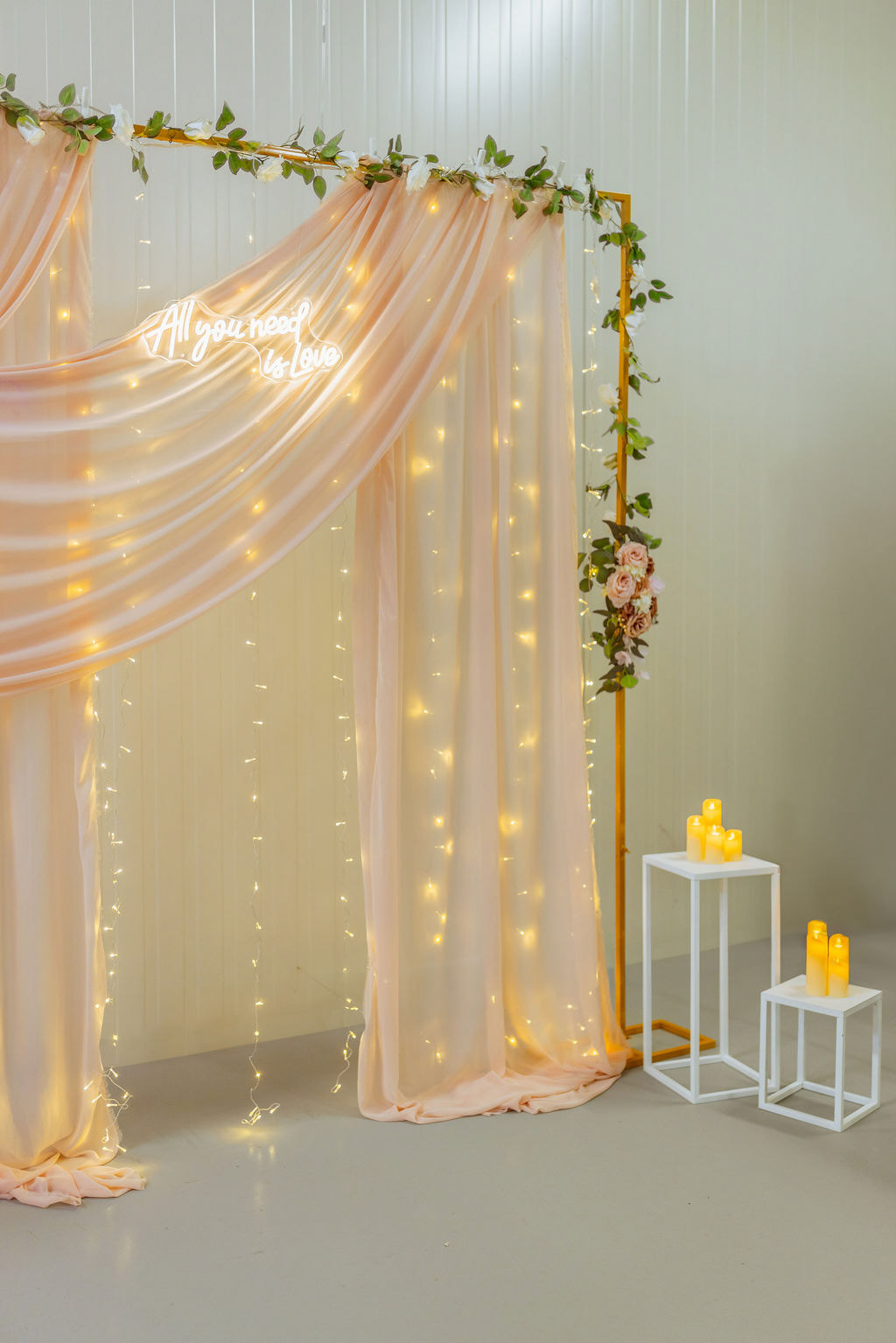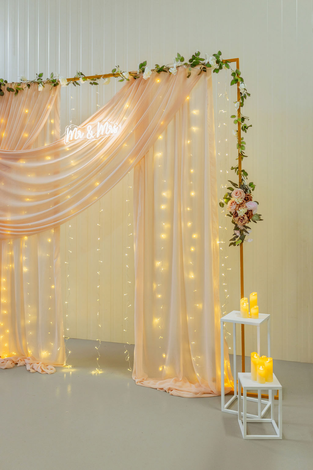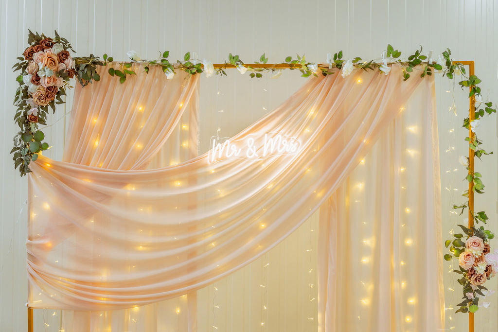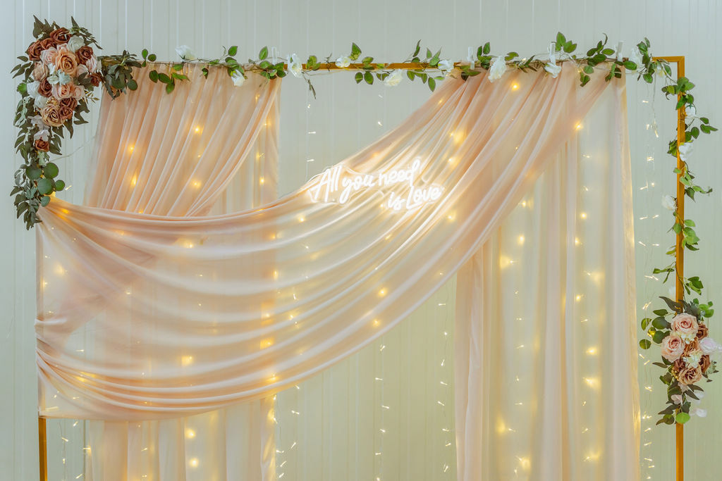 Splývavá látka v podobě šifonu v kombinaci s teplým LED světelným závojem vytvářejí příjemnou atmosféru a lichotivé světlo pro focení. Zlatý kovový rám doplněný květinovou výzdobou dodává fotostěně luxusní vzhled. Světelný nápis se stává výrazným designovým prvkem a přirozeným středobodem svatebního fotokoutku.