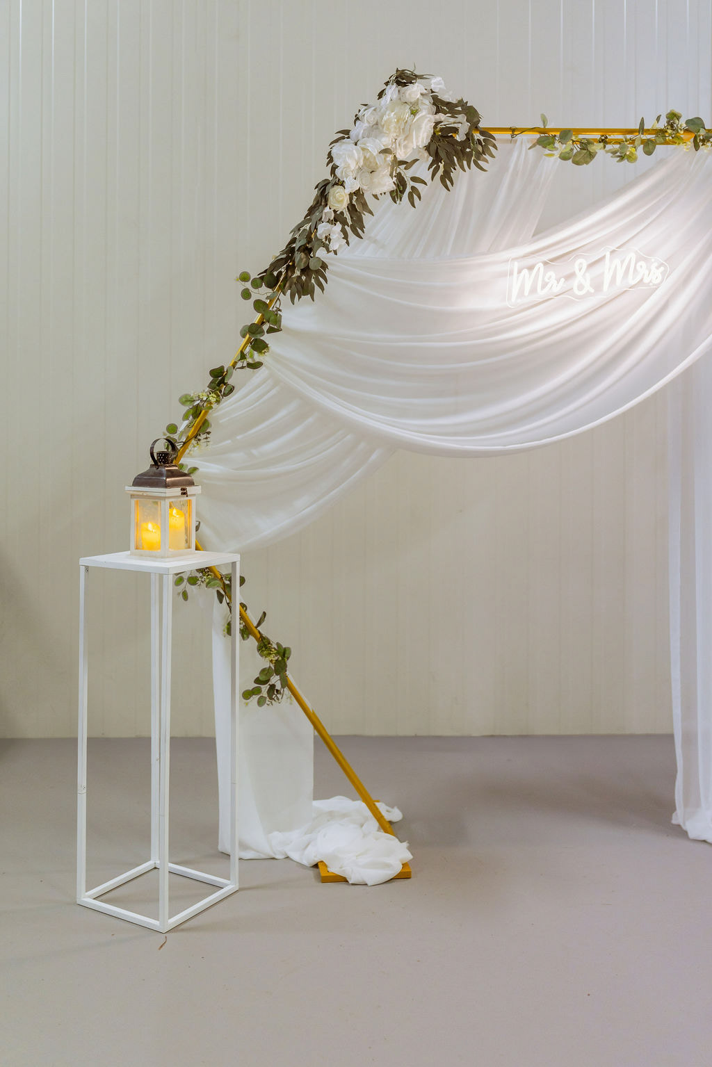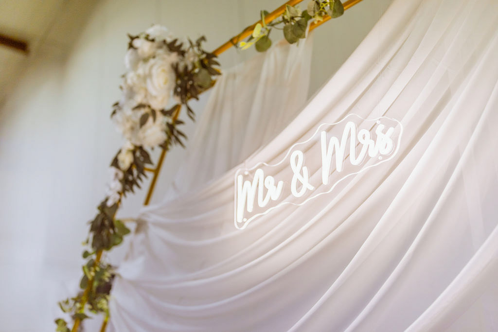 Asymetrické aranžmá látky spolu s decentní květinovou dekorací vytváří přirozené a fotogenické pozadí, které krásně vynikne jak na svatebních portrétech novomanželů, tak na společných fotografiích s hosty. Světelné doplňky dodávají stěně jemnou atmosféru a podtrhují slavnostní charakter okamžiku.
