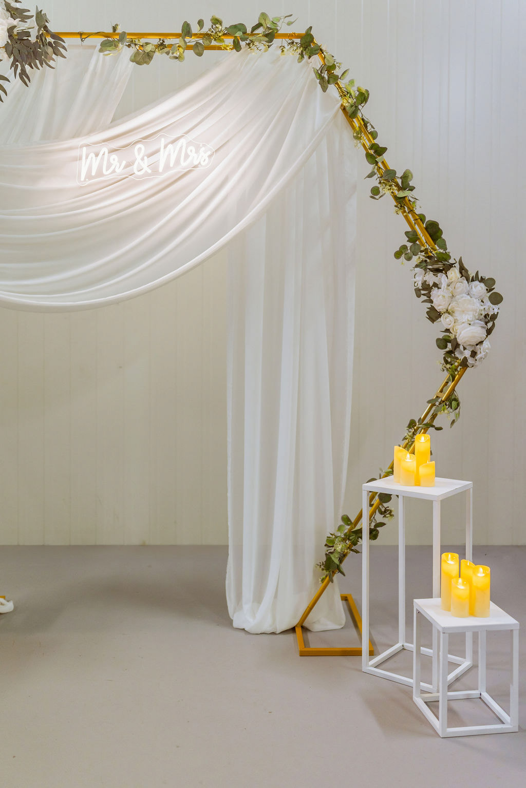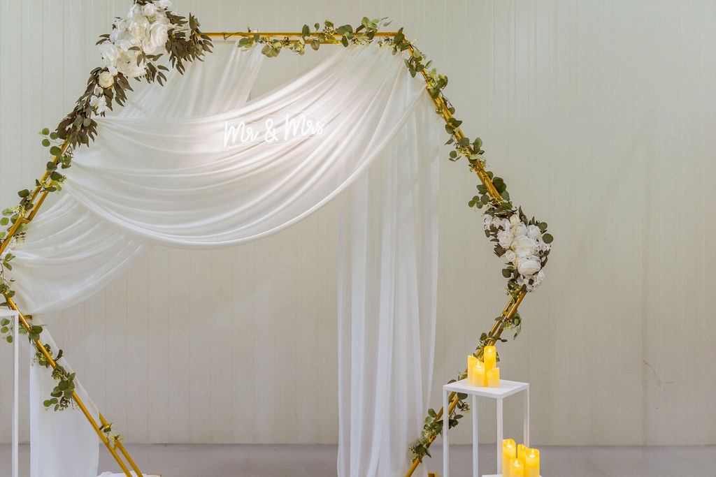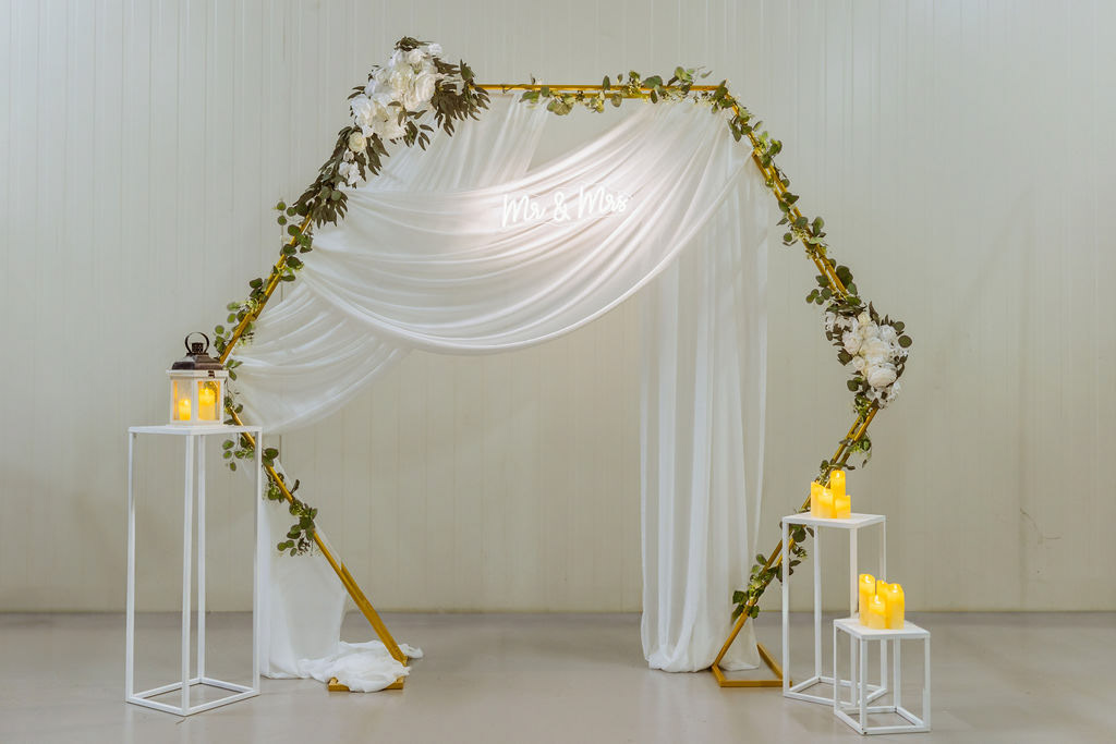 Fotostěna ve tvaru hexagonu je jemným, ale zároveň velmi elegantním prvkem svatební výzdoby. Jemná kovová konstrukce je doplněna šifonovou látkou v smetanově bílém, odstínu.