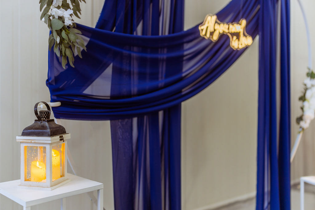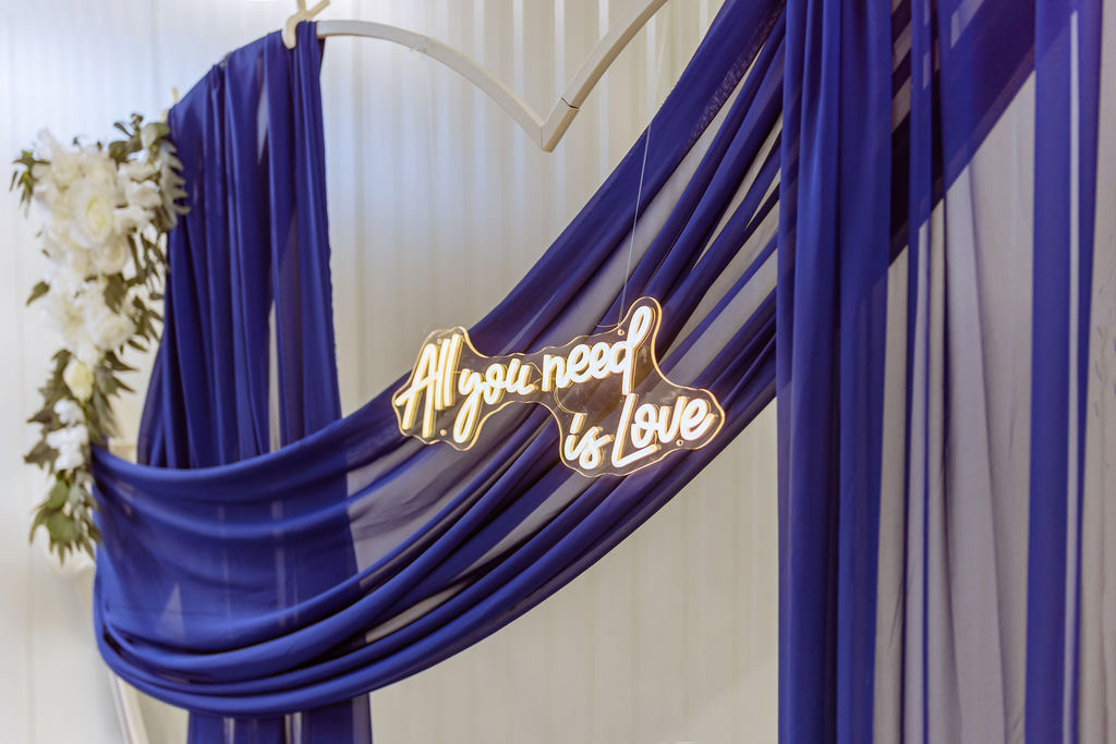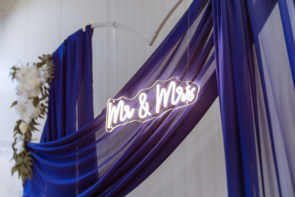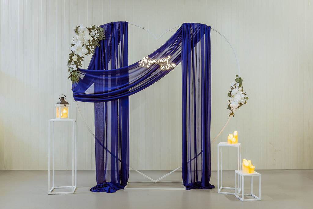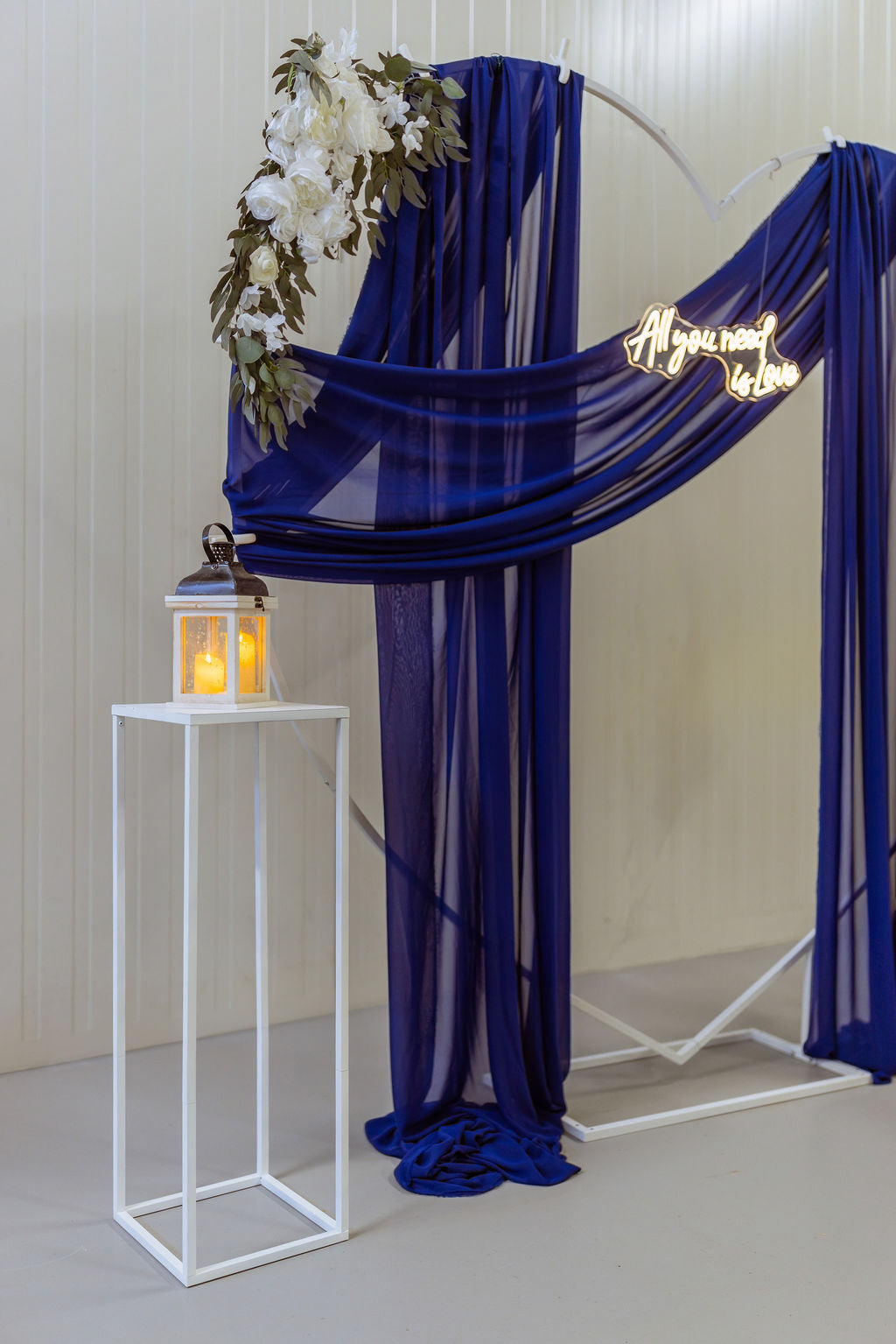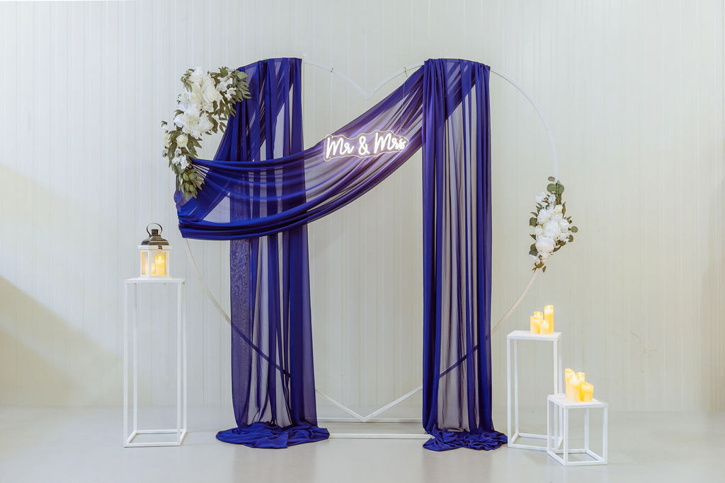 Lehká modrá textilie v podobě šifonu je elegantně aranžovaná na kovové konstrukci ve tvaru srdce a doplněná květinovou výzdobou v neutrálních tónech. Dominantním prvkem je světelný nápis „Mr & Mrs“, který podtrhuje svatební atmosféru a dodává fotografiím romantický nádech. Jemné LED osvětlení vytváří lichotivé světlo pro focení během dne i večera.